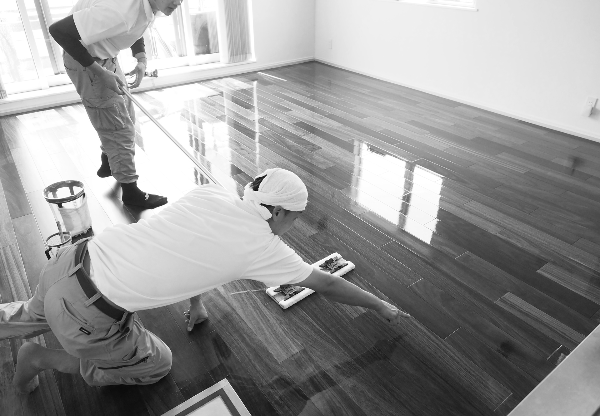 少数精鋭による熟練職人のフロアコーティング『フロアクラフト』が、大切な床を、最高の状態に仕上げることをお約束します。この仕事に誇りを持ち、お施主様の笑顔が私たちのやりがいです。